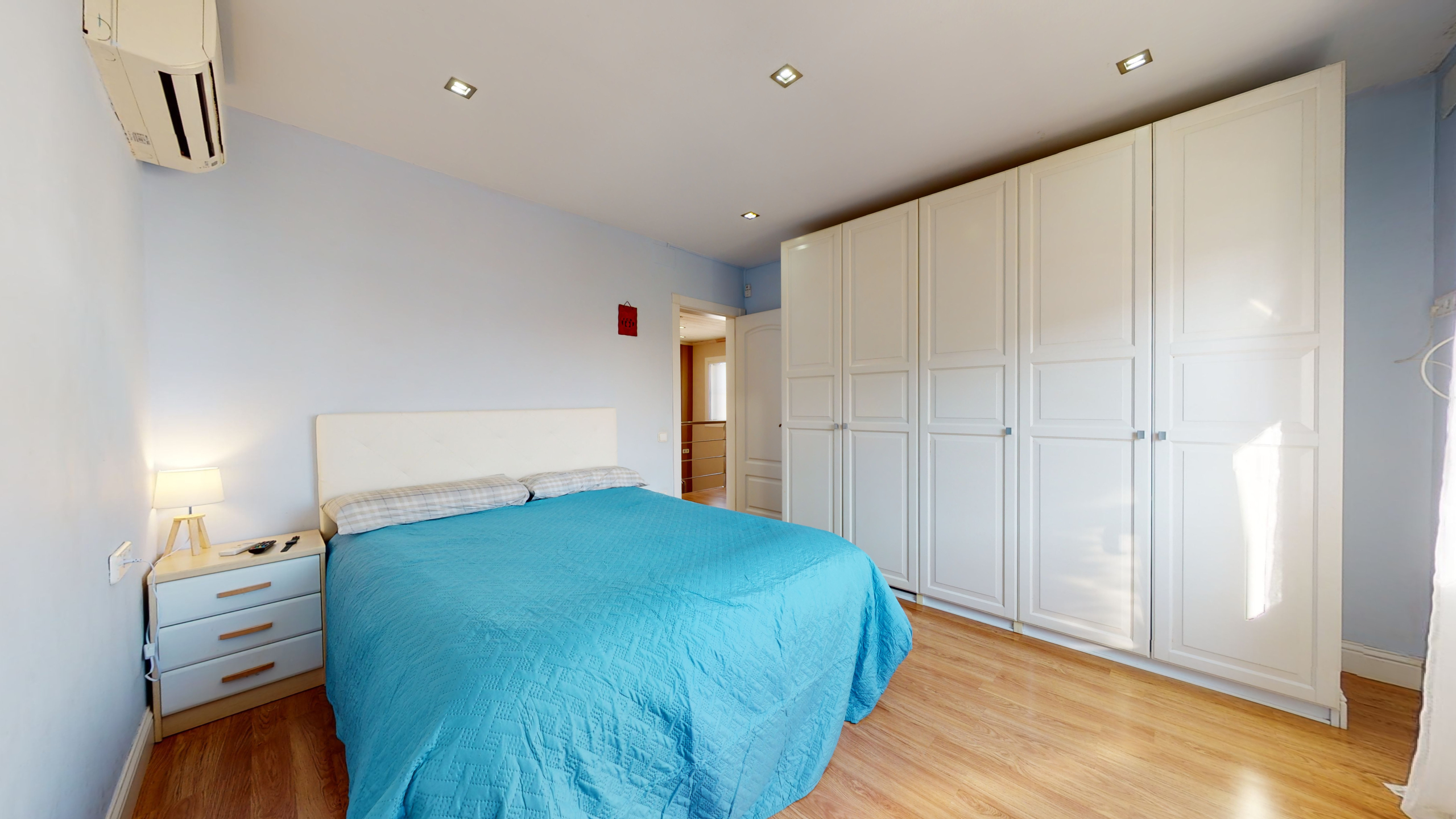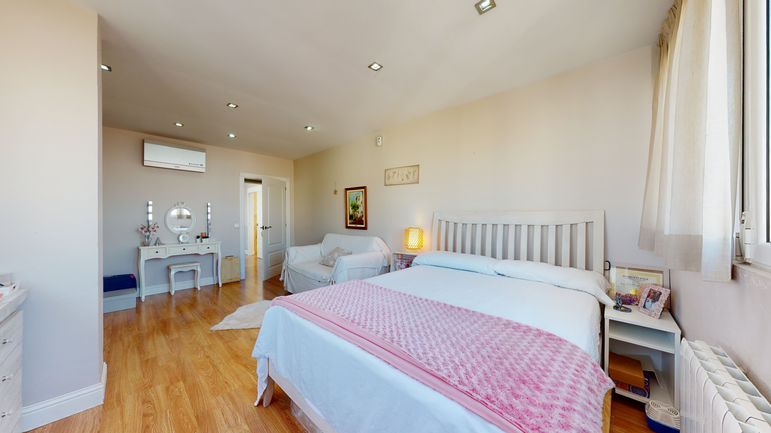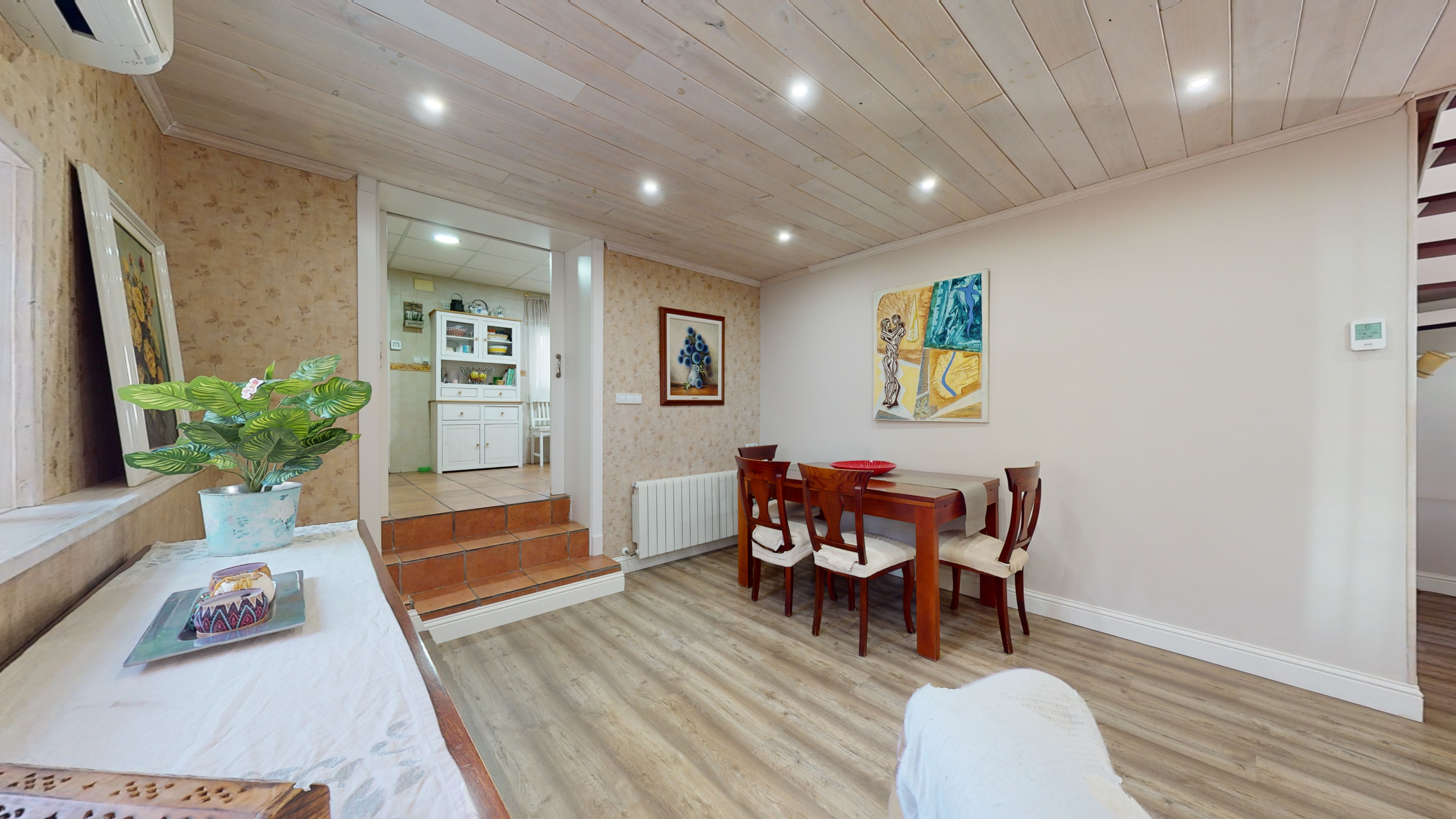 Una vez que accedemos a la planta baja, encontramos un recibidor con varios armarios, que proporcionan una gran cantidad de almacenamiento, una habitación doble, un baño grande, un salón comedor enorme y una habitación, que puede ser utilizada como trastero/vestidor, habitación para invitados o un despacho.