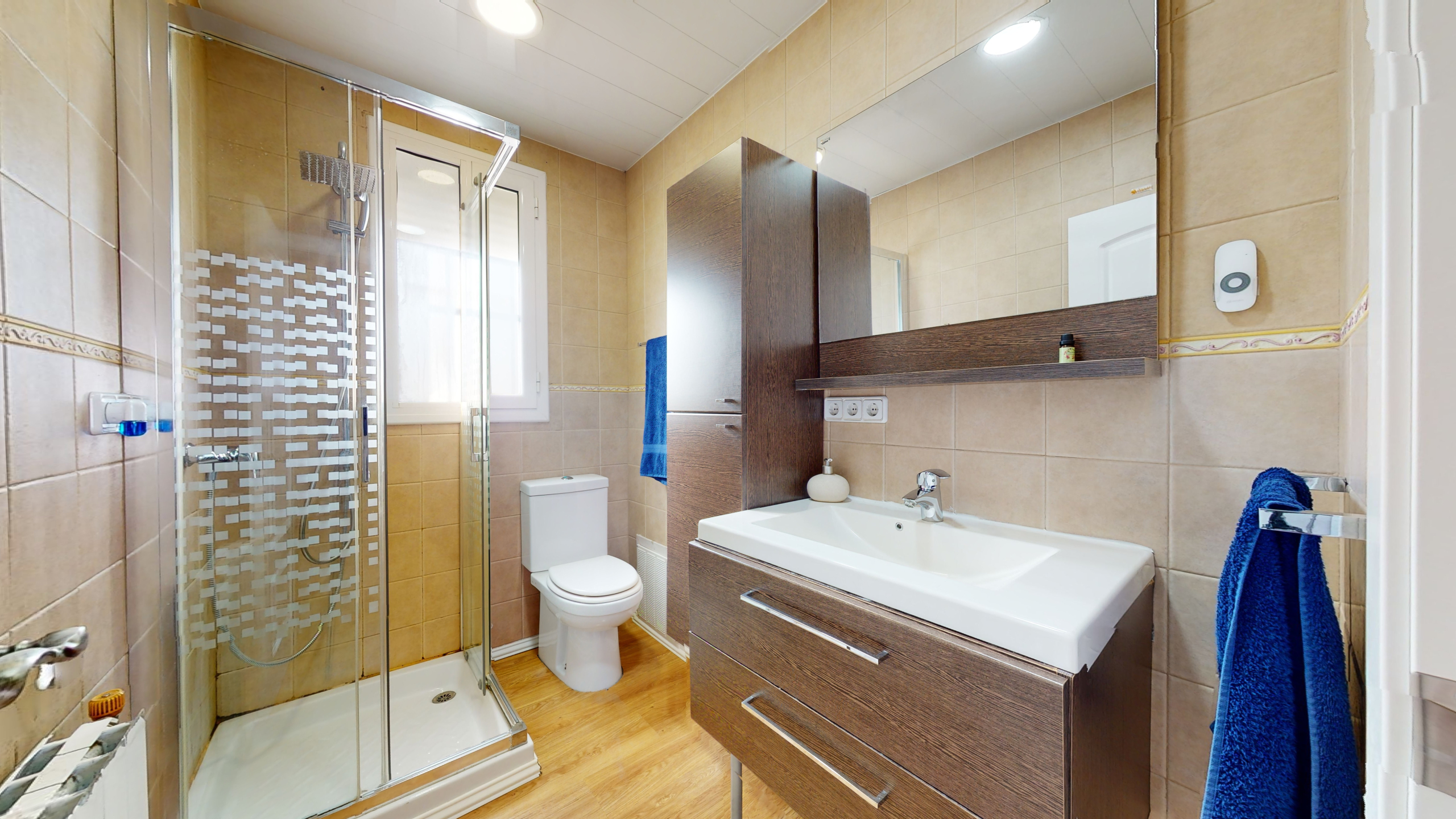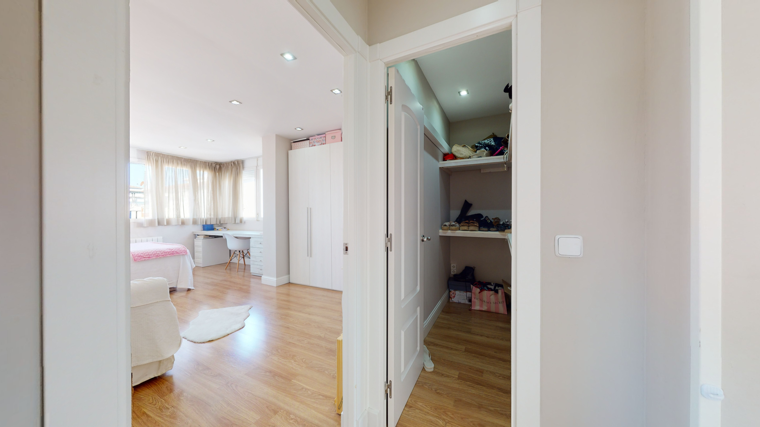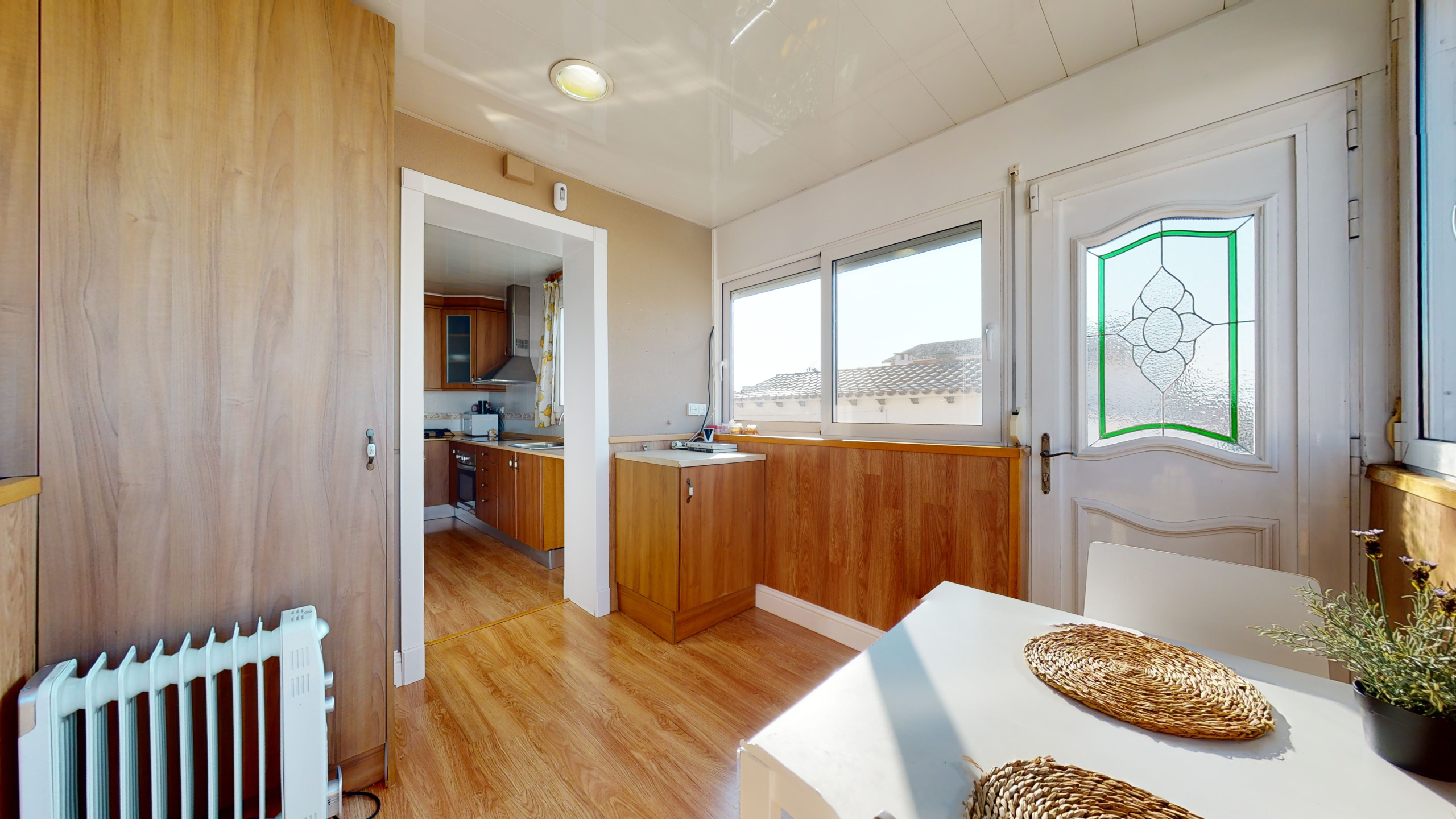 Una vez que accedemos a la planta baja, encontramos un recibidor con varios armarios, que proporcionan una gran cantidad de almacenamiento, una habitación doble, un baño grande, un salón comedor enorme y una habitación, que puede ser utilizada como trastero/vestidor, habitación para invitados o un despacho.