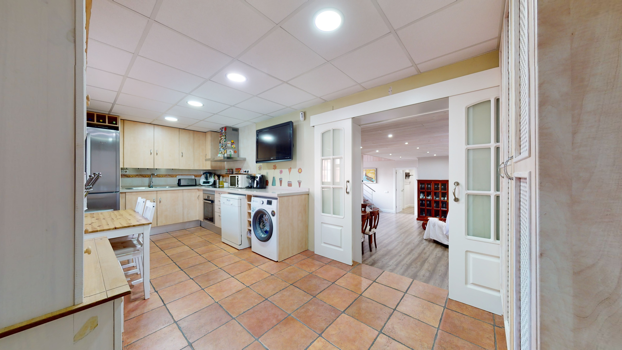 De ahí, llegamos a la cocina (muy espaciosa) con salida a un porche totalmente cubierto con unas vistas a la piscina que serán la envidia de todos los invitados, además al estar cubierto te permite disfrutarlo gran parte del año. Justo al lado, hay una zona de barbacoa, para que puedas bañarte en la piscina mientras disfrutas de ella.