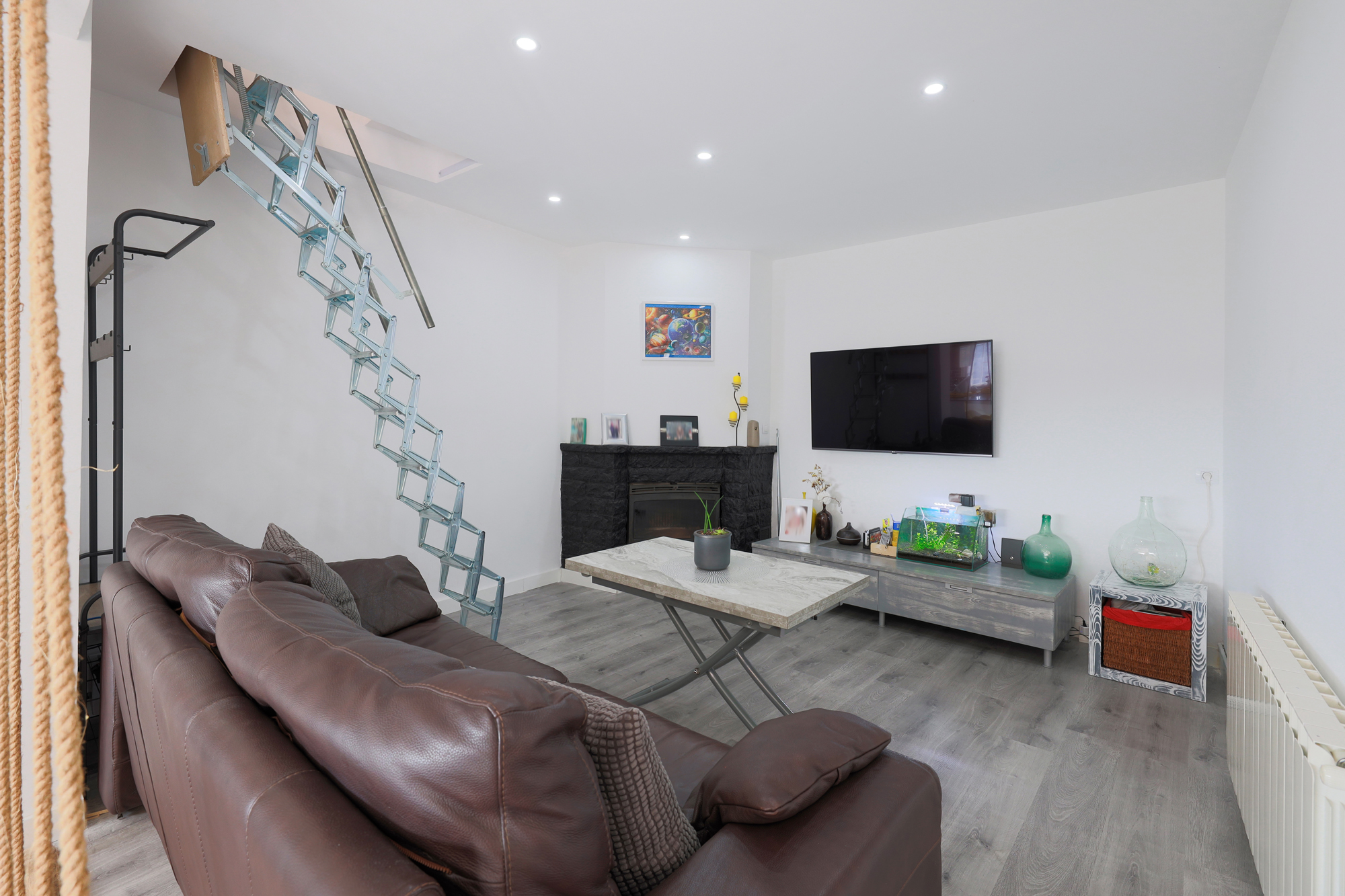 Nada más entrar, encontramos el salón comedor, con un espectacular ventanal con vistas a la terraza / solarium y a la montaña, desprendiendo luz natural todo el día. En ésta planta encontramos 2 habitaciones dobles totalmente equipadas, una cocina luminosa con módulos reutilizados y un baño completo.